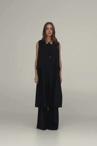 An evolution of the Column Coat, the Column Vest offers the same sculptural lines and fluid movement, reimagined in a sleeveless silhouette. Constructed from precision-cut panels, it creates a sense of shifting structure as you move, while the longline shape and sharp lapel retain a tailored edge. Worn layered or on its own, it’s a considered piece that brings quiet power and polish to weekday dressing.
