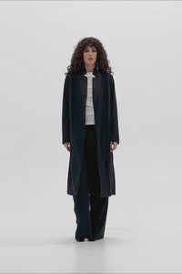 The Diffraction Coat take taylor's classic wool suiting to a new striking longline silhouette that combines timeless tailoring with modern details. Featuring an unfolded collar and lapel with a raw edge trim, this coat exudes a refined aesthetic. The slightly wrapped front is secured with a combination of exposed and hidden button closures, offering both functionality and design intrigue. Cross-tack detailing at the sleeve vent adds a touch of sophistication to the overall structure.