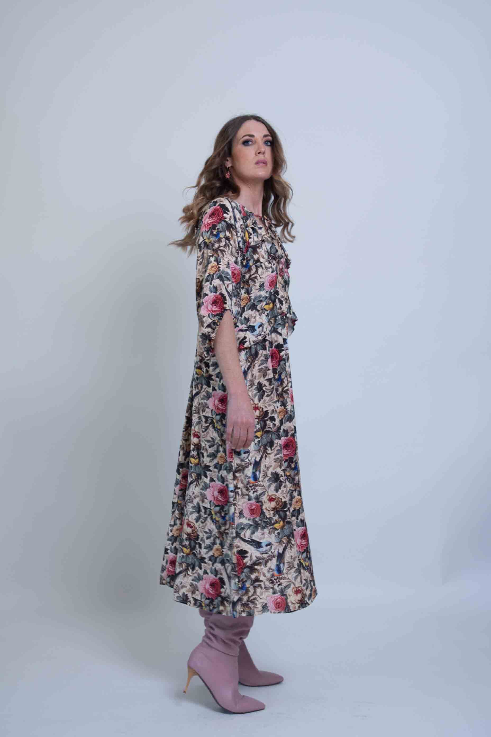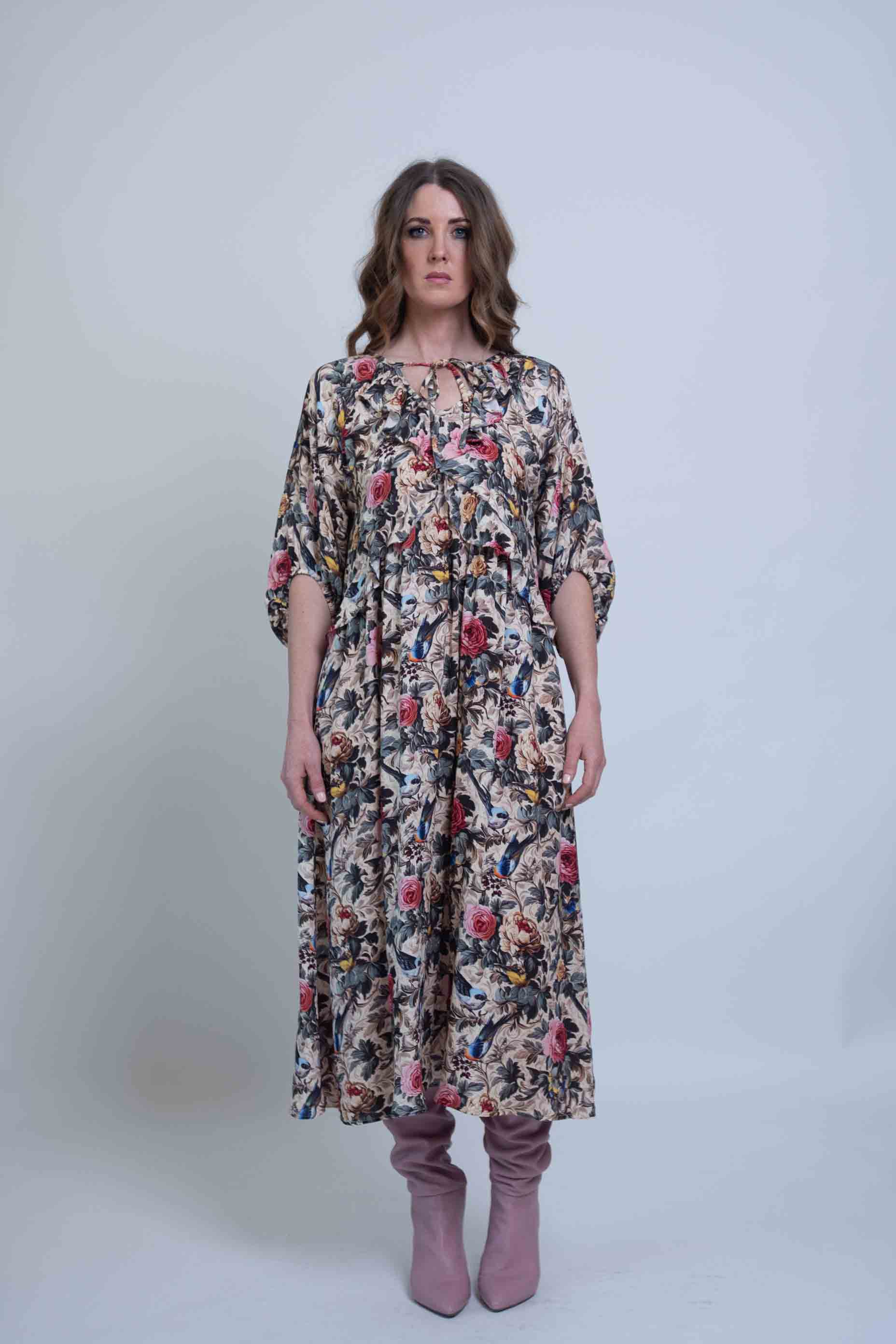 The Empire line Rosehaven Roberta midi dress, has a glamorous bohemian feel and features a gathered neckline with soft frills. It's below-the-elbow balloon sleeves offer both comfort and sleeve cover. Made from 100% Viscose crepe, this dress not only feels luxurious against the skin but also moves beautifully with your body. For sustainability and longevity, we recommend hand washing in cool water and line drying in the shade.